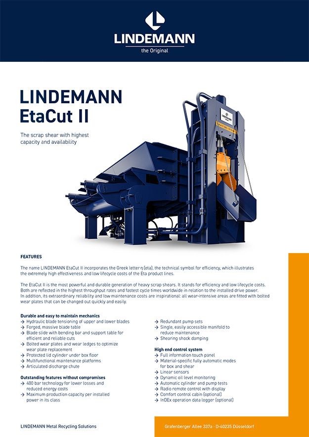 Die EtaCut II ist die leistungsstärkste und langlebigste Generation schwerer Schrottscheren. Sie steht für Effizienz und niedrige Lebenszykluskosten. Beides spiegelt sich in den weltweit höchsten Durchsatzraten und schnellsten Zykluszeiten im Verhältnis zur installierten Antriebsleistung wider. Darüber hinaus begeistert sie mit außerordentlicher Zuverlässigkeit und geringen Wartungskosten: Alle verschleißintensiven Bereiche sind mit schnell und einfach zu wechselnden verschraubten Verschleißblechen ausgerüstet.